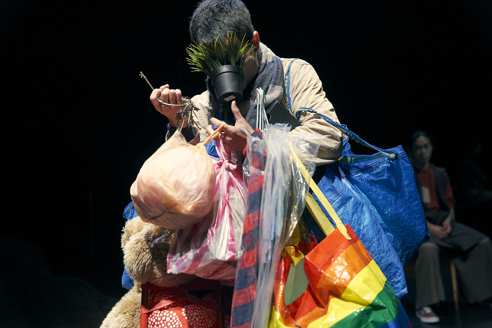 ★有著貝克特式的荒謬、瑪姬・瑪漢的蒼涼,表演者從黑暗的隧道前來,在褐土上負重躑躅,被大量生活瑣物拖垮,無故對著周遭事物發怒與憤懣,再百般聊賴地頹坐。